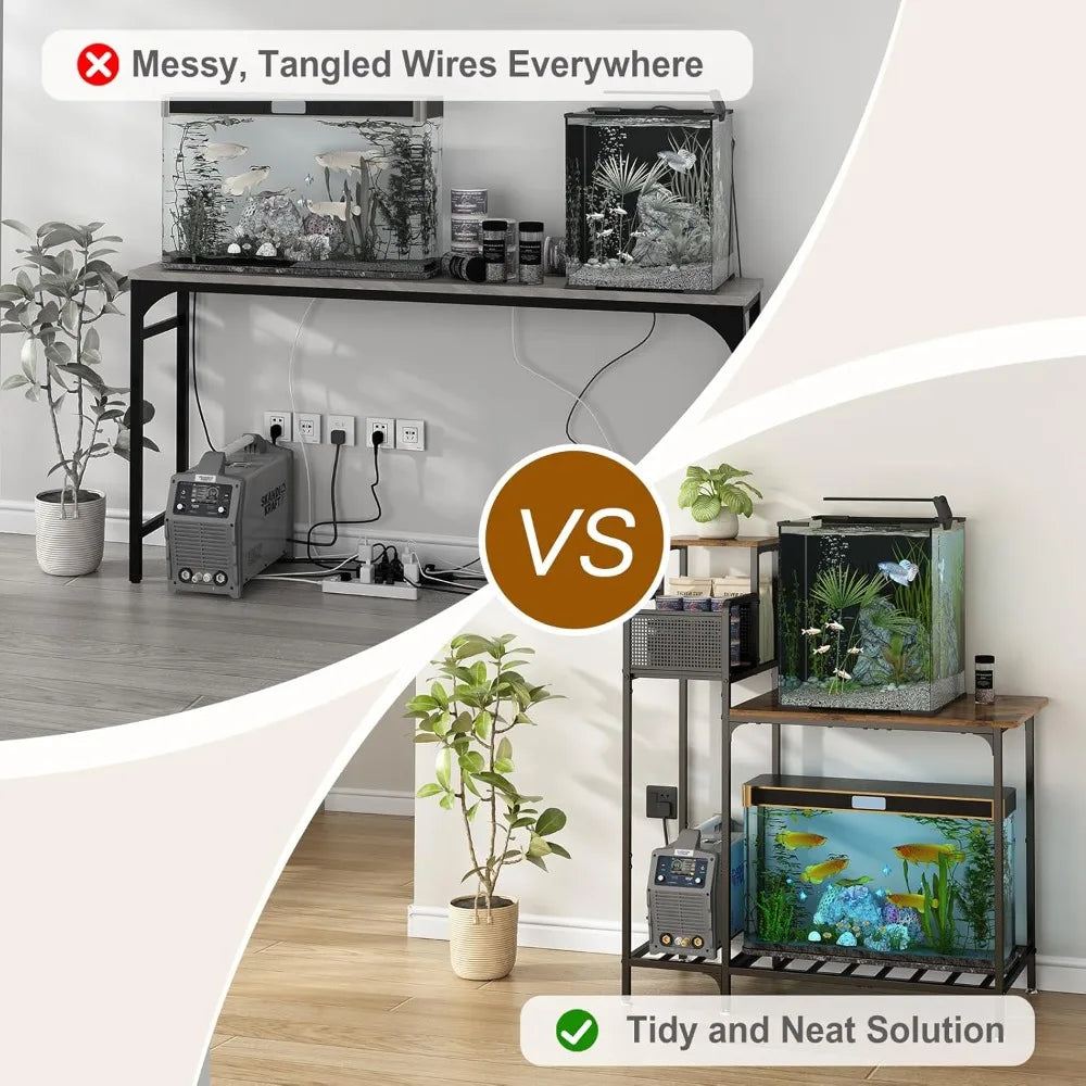 Designed for vertical space optimization, the top tier comfortably hosts a larger aquarium while the bottom tier is ready for a second 10-20 gallon tank. On the left side, two storage layers keep fish food and accessories neatly organized, so everything you need is within easy reach.