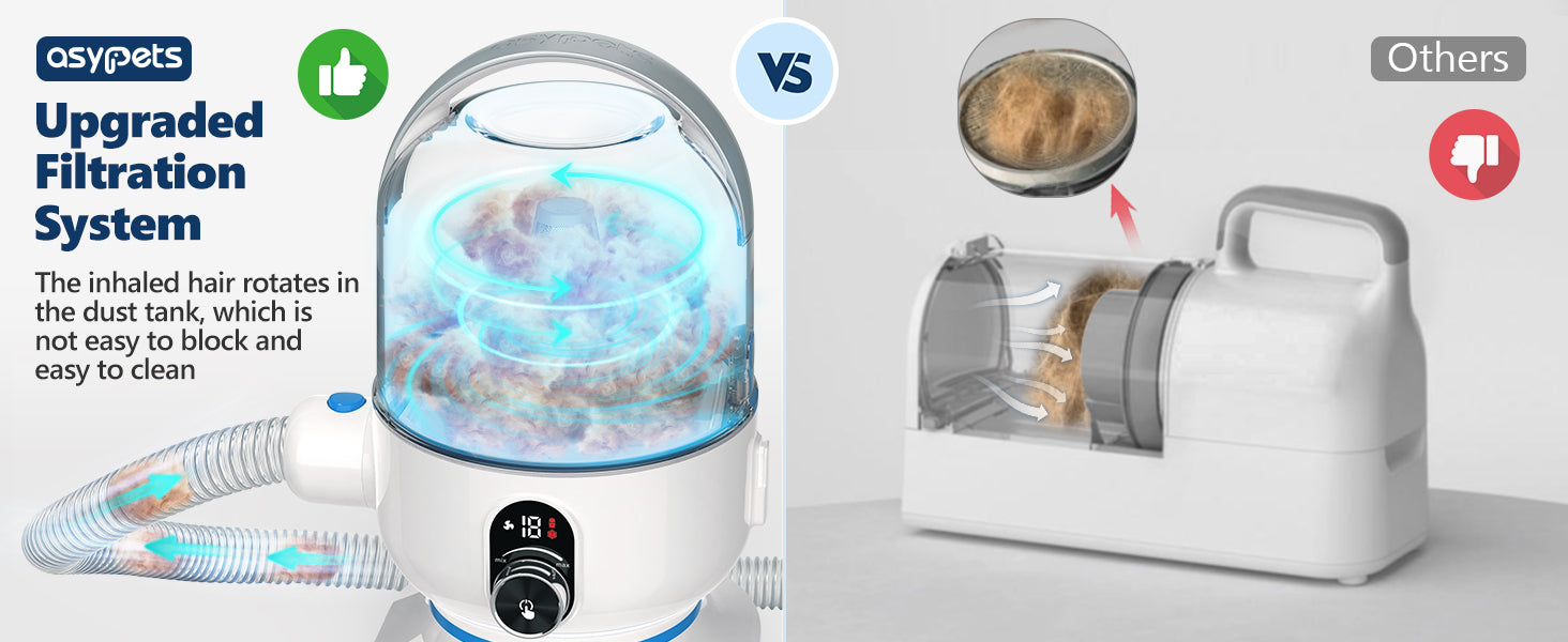 The Dog Grooming Kit with 2L Vacuum Suction features an innovative cyclone air intake system, preventing hair from clogging the filter while ensuring optimal performance every time.