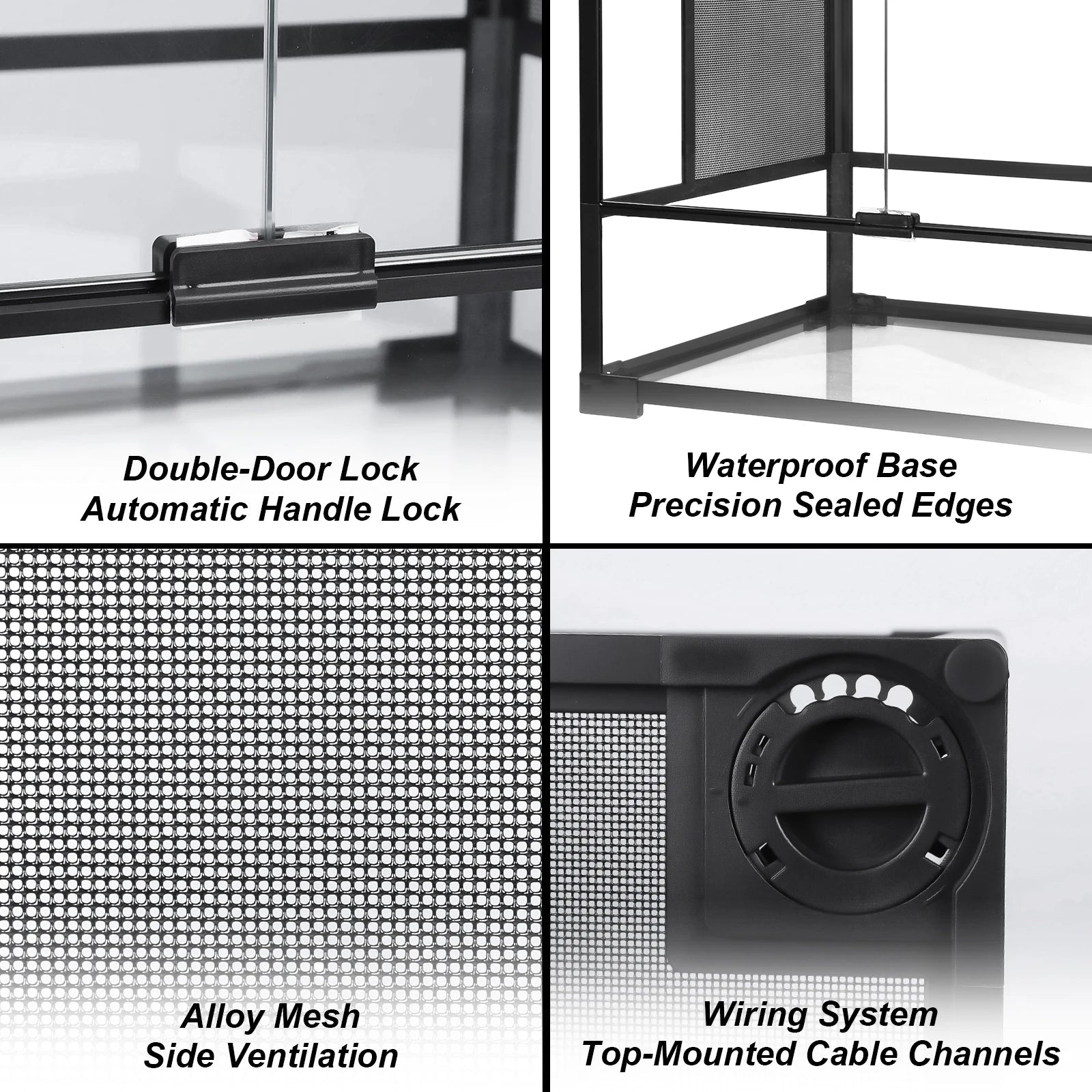 - Front Doors with Secure Lock — Front doors open independently for feeding, cleaning, and décor changes, with a reliable lock to prevent escapes.