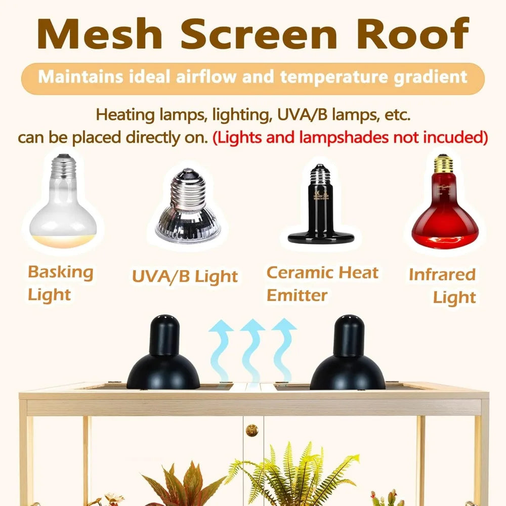 - Mesh lid on top ensures optimal ventilation and a secure surface for heat lamps or UVA/UVB lights (lamps not included).
