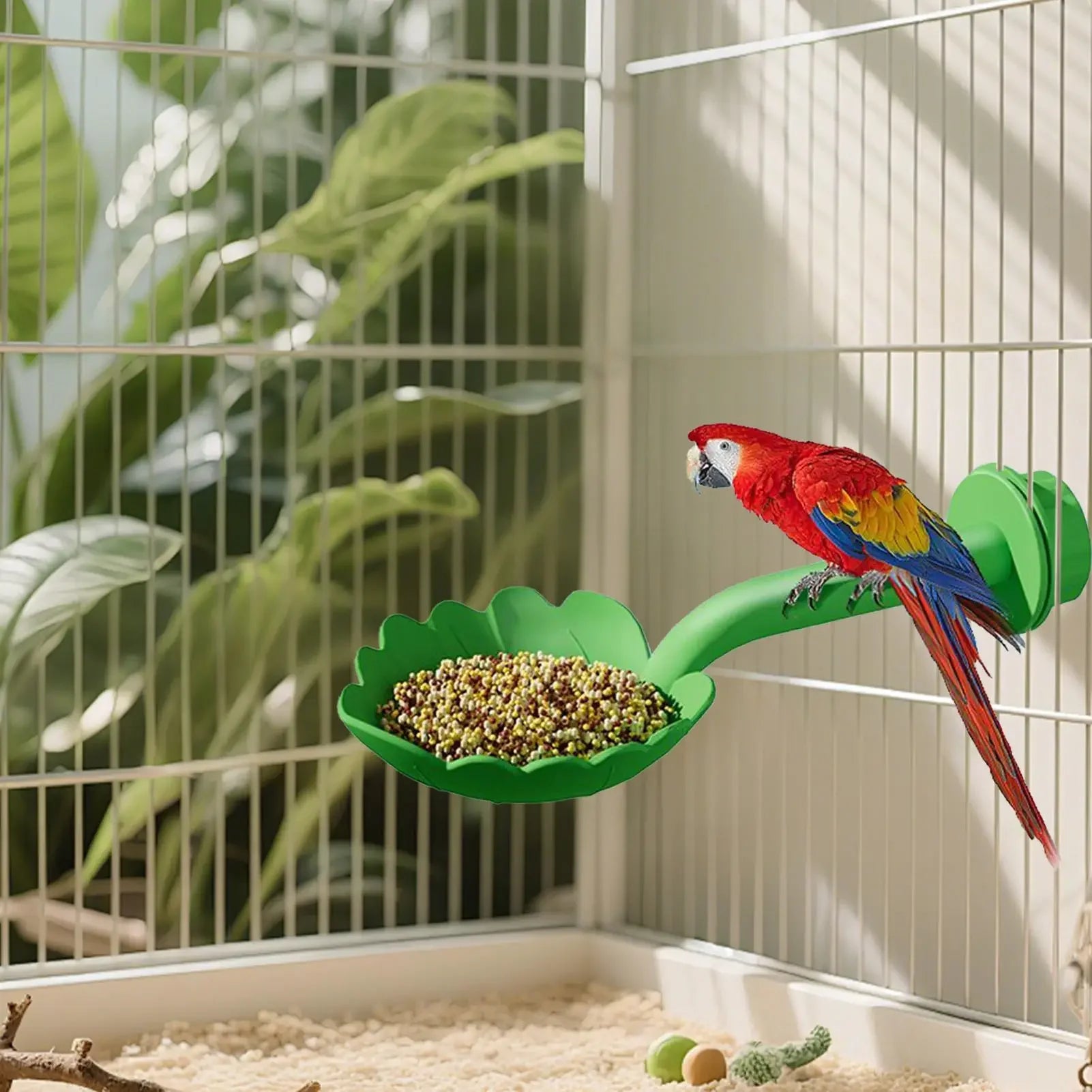 Elevate your feathered friend's cage life with the Parrot Stand Perch Feeder — a leaf-shaped tray cage perch that doubles as an interactive play gym. This multi-functional accessory frees up space, turning feeding time into an engaging, natural-claw exercise while keeping your cage neat and organized, even in compact environments.