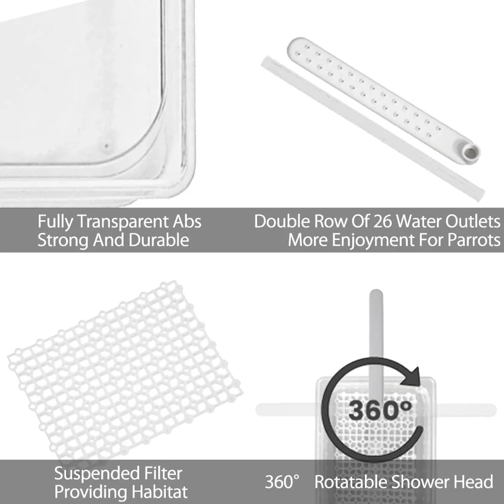 - Spacious, versatile design — measuring 13.4 x 12.8 x 10.4 inches (34 x 32.5 x 26 cm), it accommodates most birds, with an elevated shower head for fully coverage.
